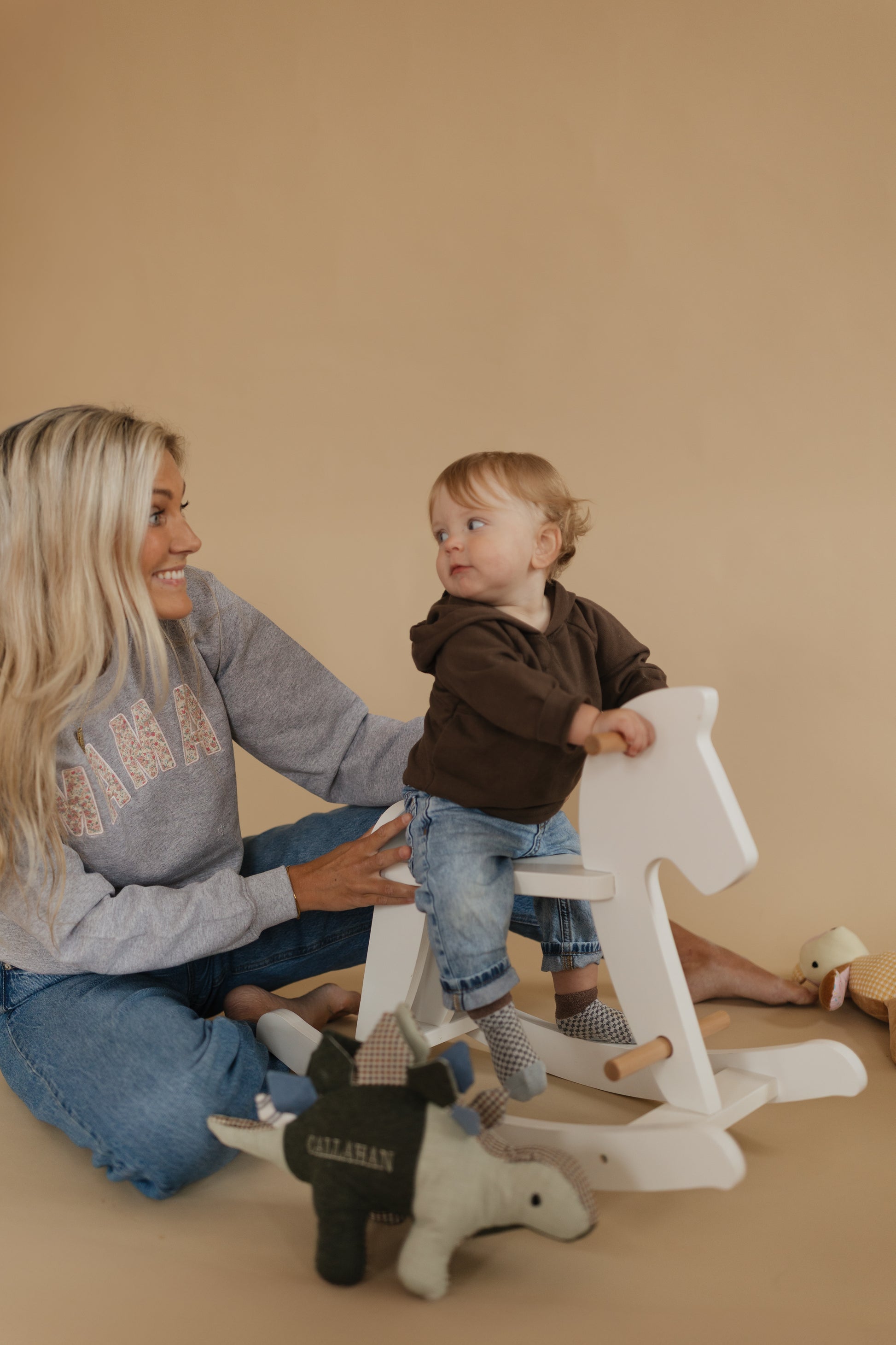 Our Memory Sweaters are custom-made using your baby’s clothing, carefully stitched to spell “Mama,” “Grandma,” “Auntie,” “Nana” or whatever you'd like across a cozy, everyday sweater. Each letter is created from the outfits that hold your most cherished memories — first cuddles, first steps, and all the little moments in between — transforming them into something you can wear and hold close.